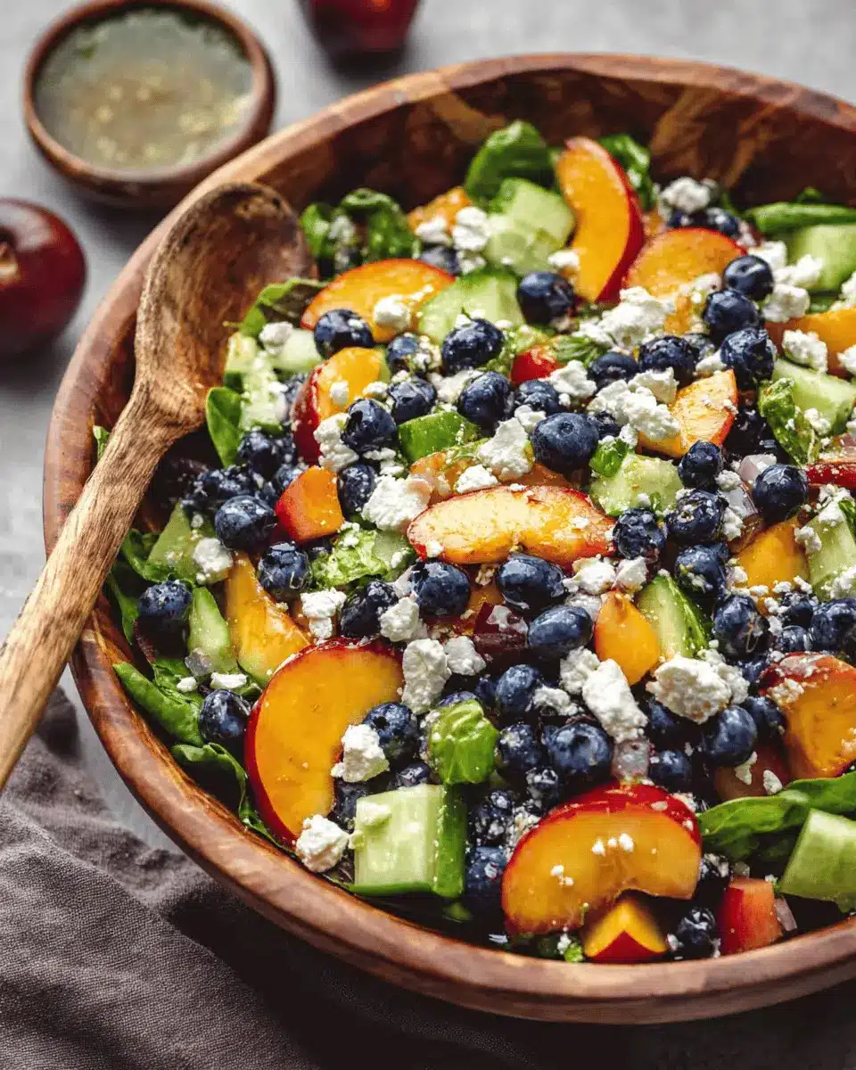 This vibrant salad is rich in antioxidants and vitamins, thanks to the blueberries and peaches. Plus, the feta adds a touch of creaminess and protein, while the dressing delivers healthy fats from olive oil. For more on the health benefits of these ingredients, check out Healthline. Are you ready to enjoy a salad that’s as healthy as it is flavorful?