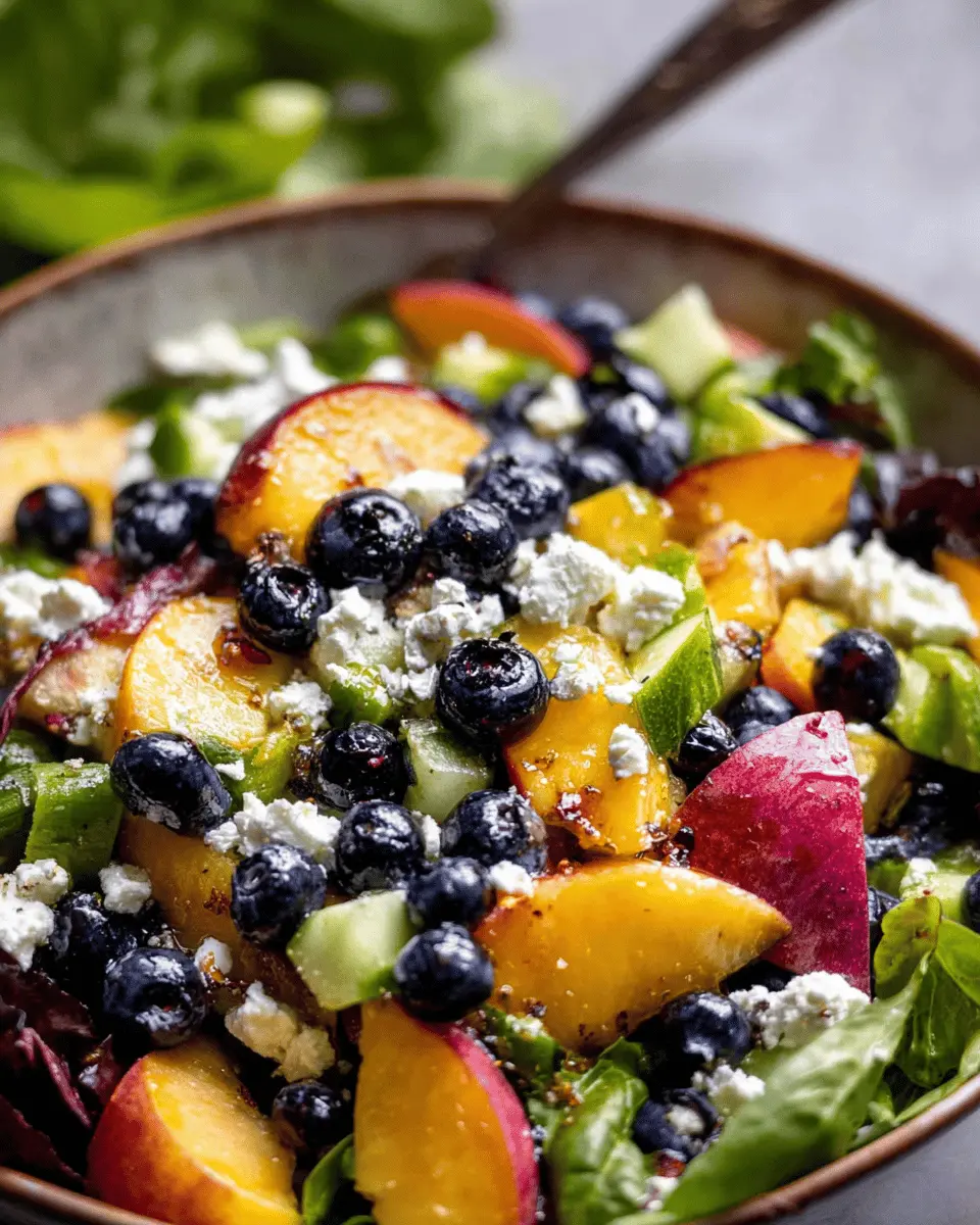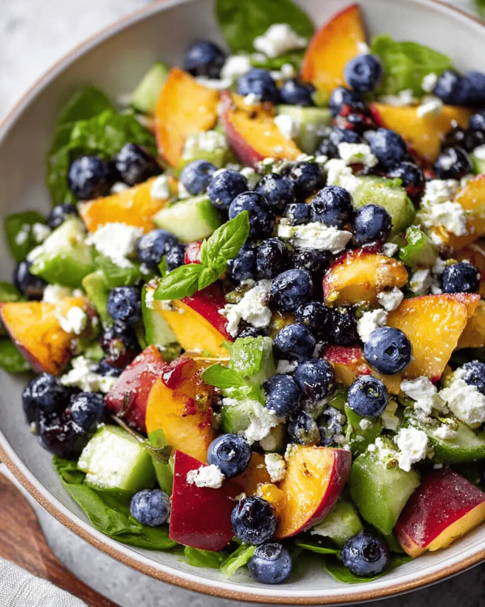 This salad combines juicy, ripe peaches and antioxidant-rich blueberries, offering a burst of freshness with every bite. Did you know that blueberries are often dubbed "superfoods" due to their numerous health benefits? They can support heart health and are excellent for skin rejuvenation. Paired with creamy feta cheese, crunchy Persian cucumbers, and a zesty homemade vinaigrette, this salad strikes a perfect balance between flavors and textures.
