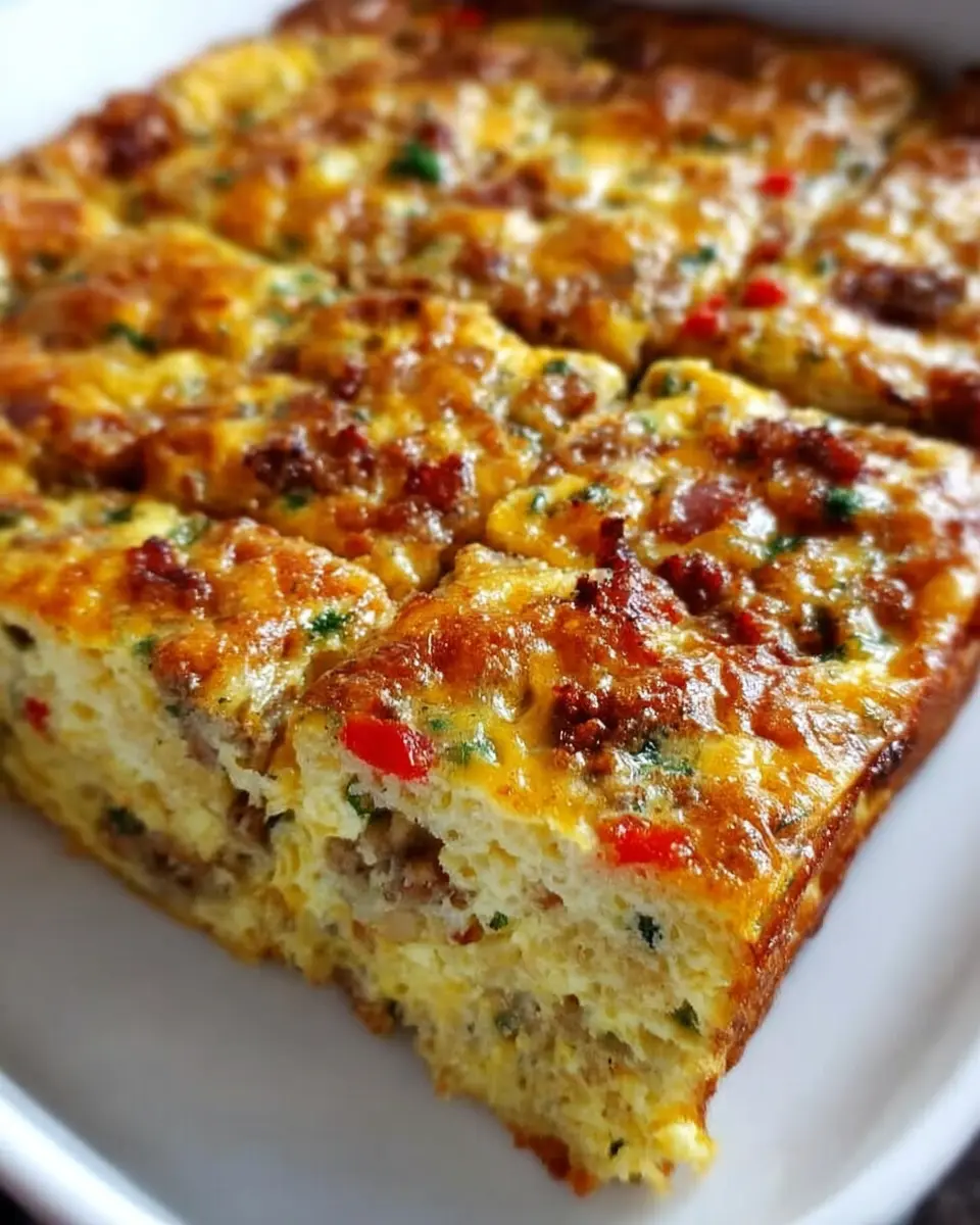 Now, it’s time to bring everything together. Pour the cooked sausage and sautéed vegetables into the bowl with your egg mixture. Stir gently to combine all the ingredients. Pour the mixture into a greased 9x13-inch pan and sprinkle the top with some extra cheese for that ooey-gooey finish.