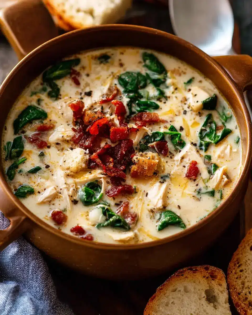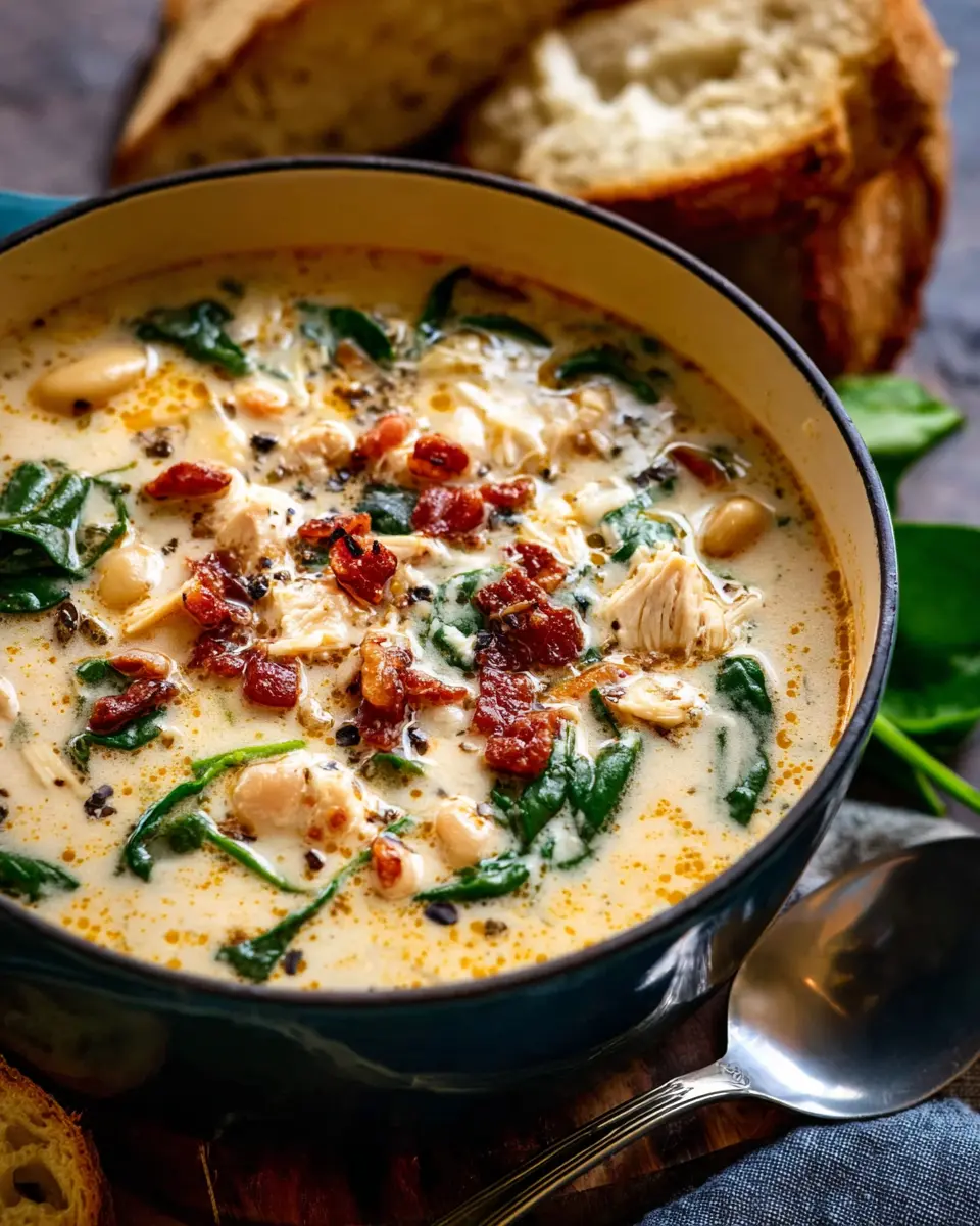 To enhance your creamy Tuscan chicken soup, consider pairing it with warm, crusty bread. A toasted baguette or a slice of sourdough is perfect for dipping and soaking up all that delicious broth. For a fresh touch, serve a side salad with mixed greens and a simple vinaigrette to balance the richness of the soup. You might even want to sprinkle some crispy turkey bacon on top for added crunch and flavor!