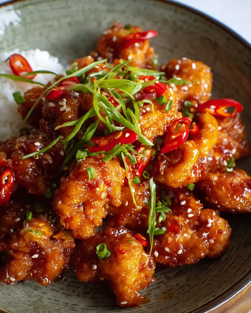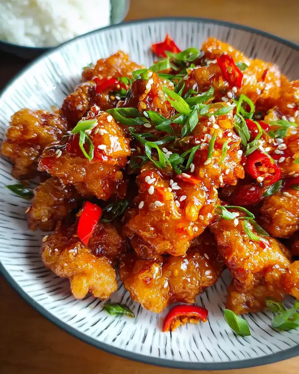 Your Crispy Sweet Chilli Chicken is now ready to shine! Serve it immediately over a bed of steamed rice, garnished with finely sliced spring onions and a sprinkle of sesame seeds. For extra sauce lovers, consider adding a splash of boiling water to the pan before serving to scrape up the leftover flavours.