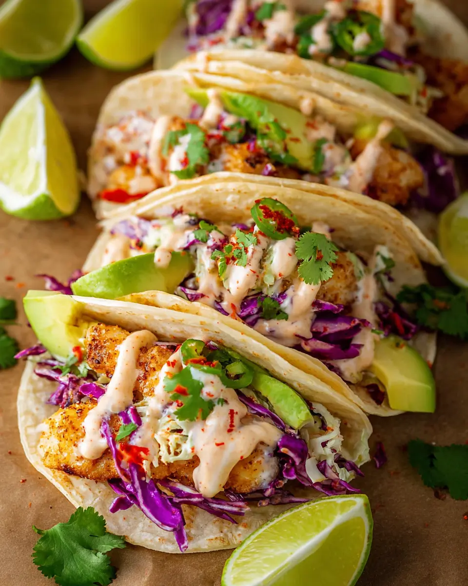 These fish tacos are not only quick and easy to make, but they also bring together fresh veggies, creamy sauce, and perfectly seasoned fish, making every taco a flavor-packed experience. So why not take a break from fast food? Dive into this recipe and celebrate the joy of cooking!