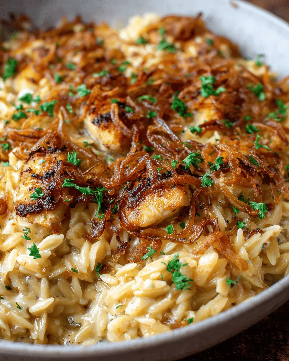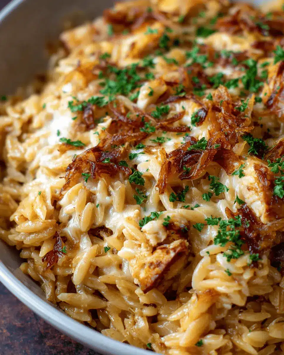Elevate your French Onion Chicken Orzo Casserole with delightful garnishes. Fresh herbs like parsley or thyme add a burst of color and flavor. Consider a drizzle of balsamic glaze for a sweet tang that complements the creamy richness of the dish. Crunchy fried onions sprinkled on top before serving provide a satisfying texture contrast that your guests will love.