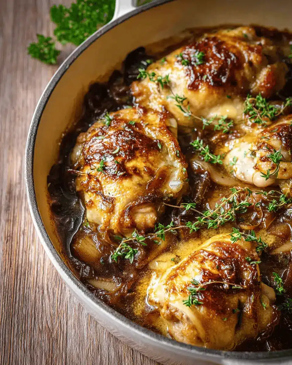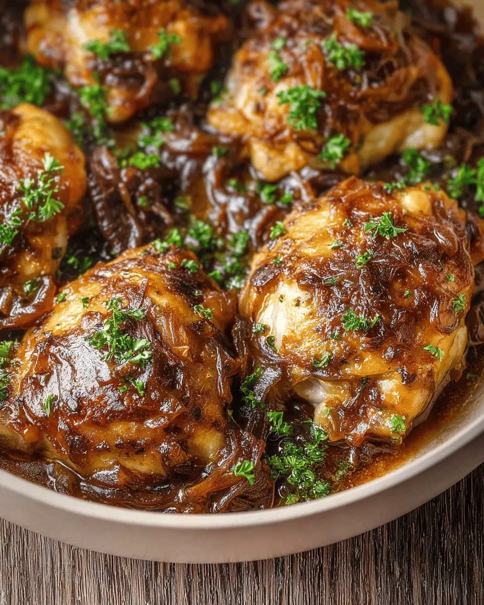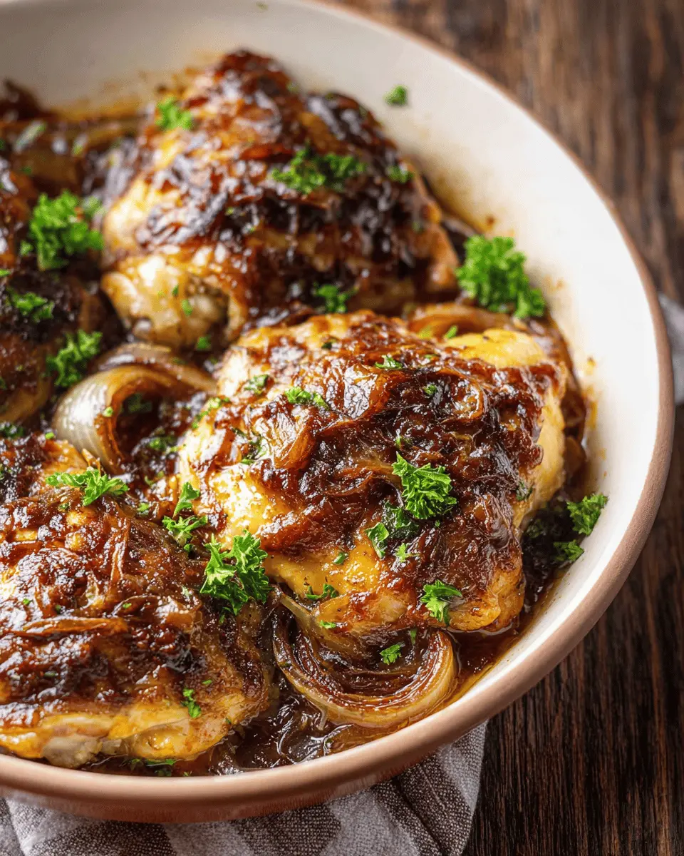 French Onion Chicken Thighs is a comforting dish that blends savory flavors and tender chicken for an unforgettable meal. This recipe is perfect for a weeknight dinner or special occasion. Pair it with a side of garlic mashed potatoes or crusty bread, and enjoy the heavenly combination of melted cheese and rich sauce. Happy cooking!
