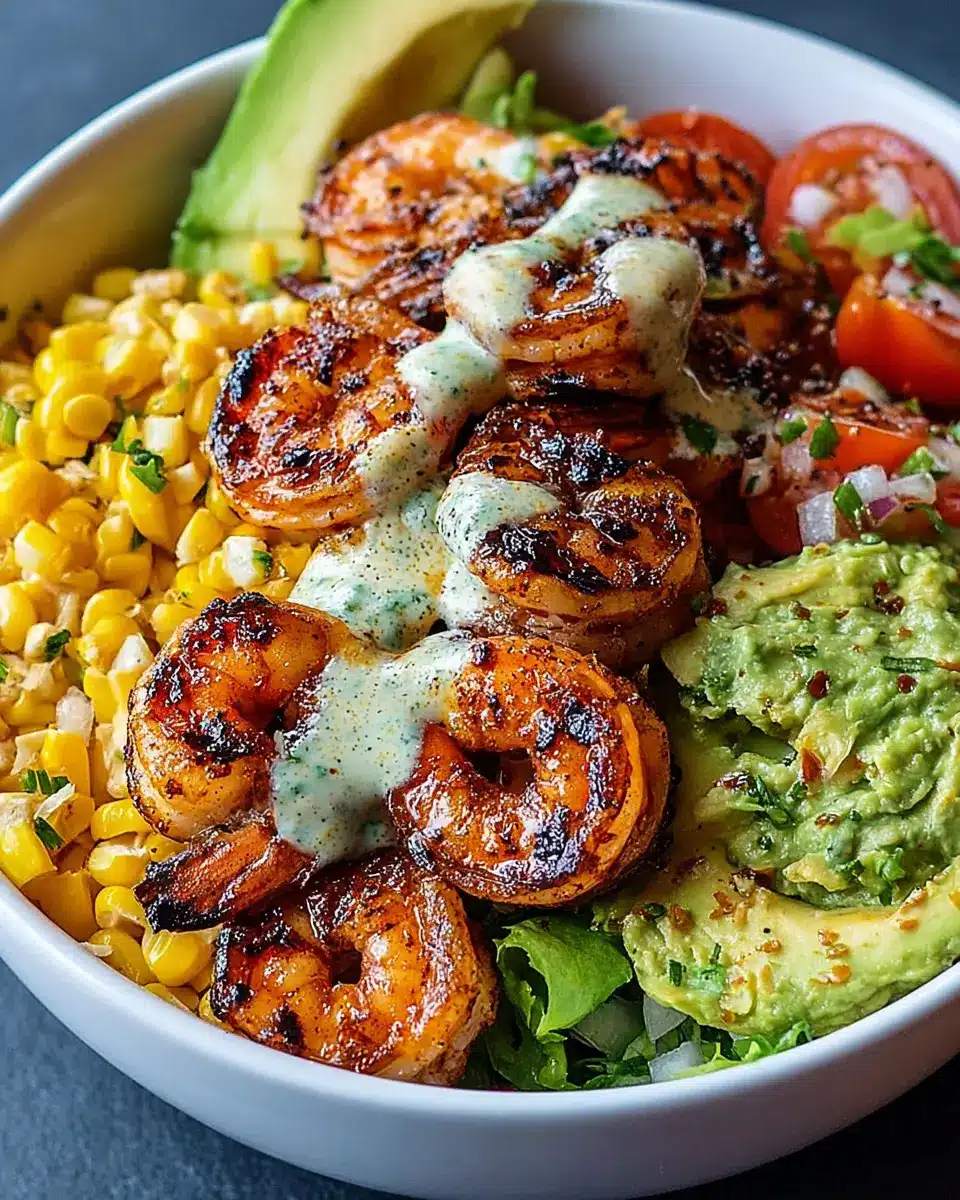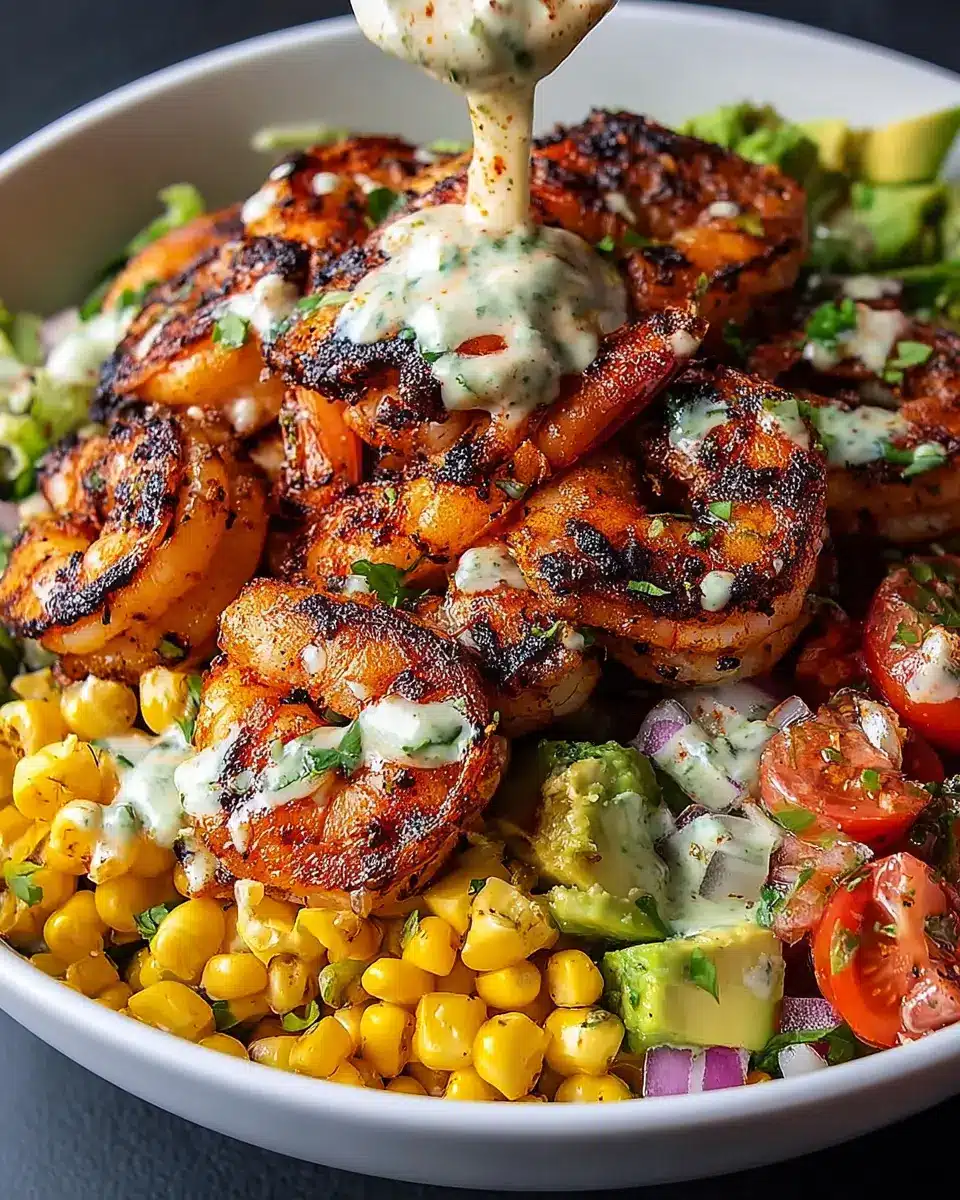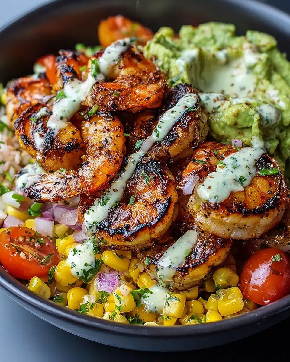 Grilled Shrimp Bowl with Avocado, Corn Salsa & Creamy Garlic Sauce