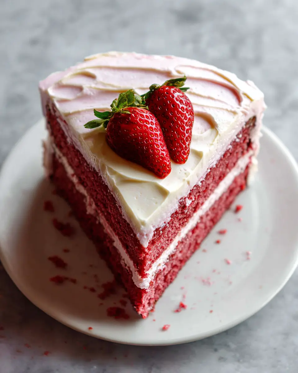 The moment has arrived to assemble your homemade strawberry cake! Level off the tops of your cooled cake layers with a serrated knife for a polished finish. Place one layer on your cake stand, slather on about ¾ to 1 cup of frosting, and then add the second layer upside down for stability. Apply a thin crumb coat of frosting over the whole cake and chill for about 20 minutes to set. Finish off with the remaining frosting, smooth it out, and refrigerate until ready to serve. There you have it—a stunning homemade strawberry cake, made from scratch with love!