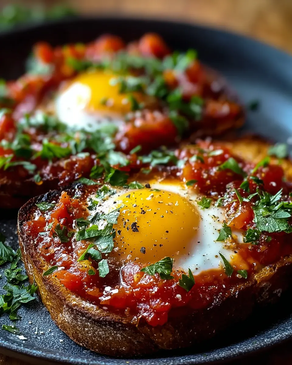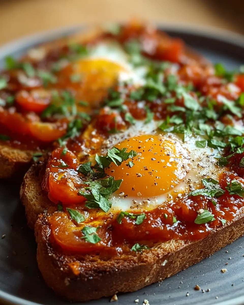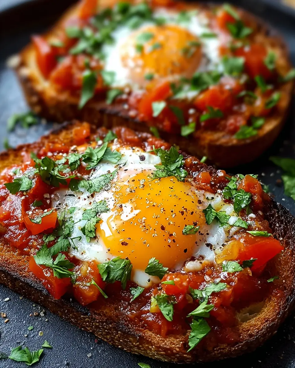 - Assemble Toast: Place the toasted bread on plates. Generously spoon the shakshouka sauce and perfectly cooked eggs over the top, creating a beautiful, hearty dish.