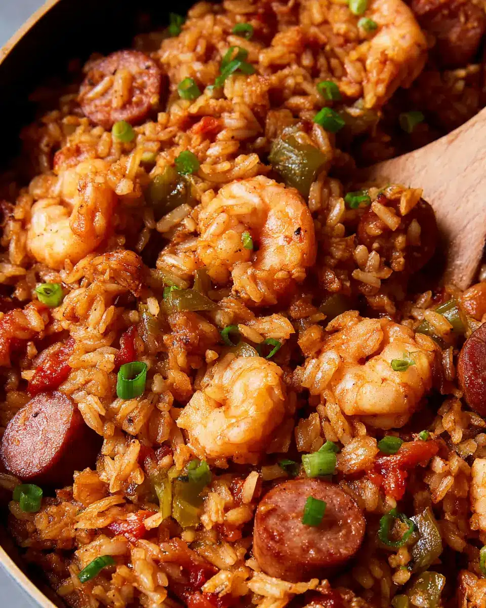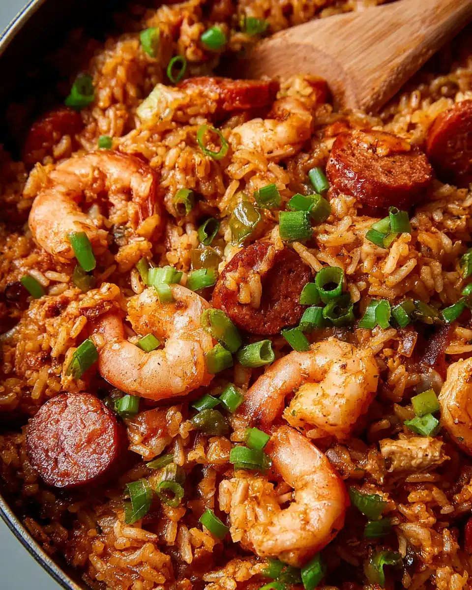 Just before serving, fold in one pound of peeled and deveined medium shrimp. Cook them by tossing occasionally until they turn pink and are just cooked through—this will take about 3 to 5 minutes. For a fresh finishing touch, serve your jambalaya topped with thinly sliced scallions.