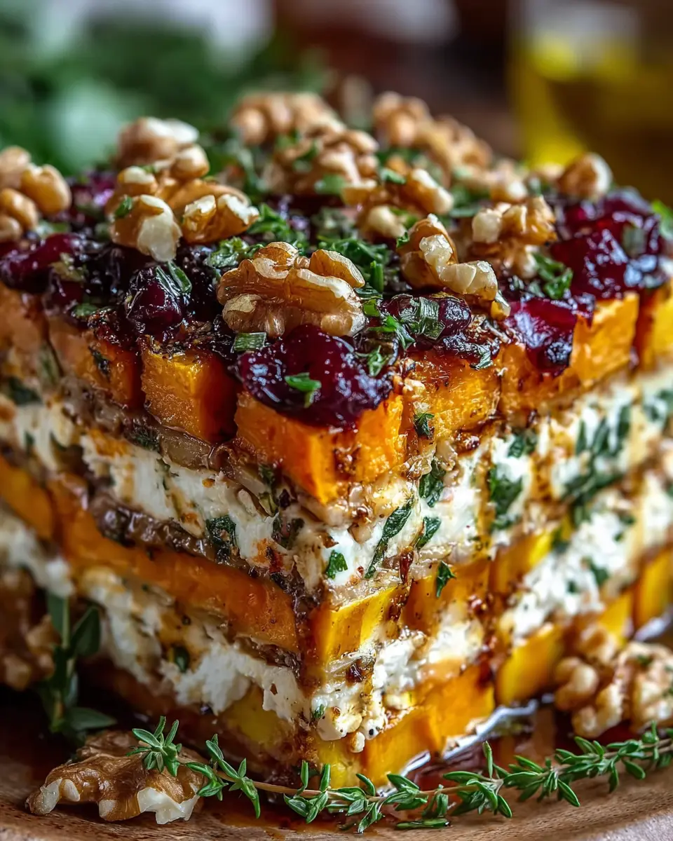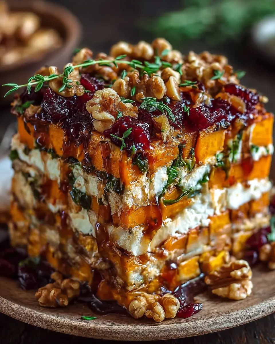 Layered Sweet Potato, Butternut Squash, Carrot Lasagna with Feta, Walnuts, and Cranberry-Honey Glaze