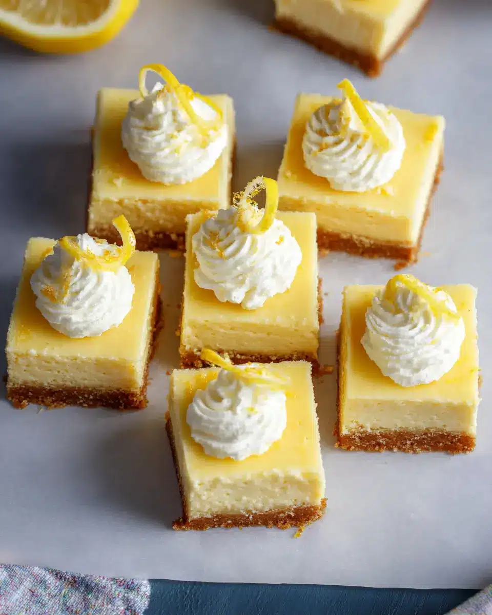 Presentation matters! Serve your lemon cheesecake bars on a rustic wooden platter or a bright white cake stand for a stunning display. Add a sprinkle of powdered sugar or a few zest shavings on top for that extra touch. Don’t forget to cut the bars into perfect squares—neat edges and clean cuts make all the difference. For an elegant finish, garnish with a sprig of fresh mint. This not only looks inviting but will make your dessert the star of any gathering!