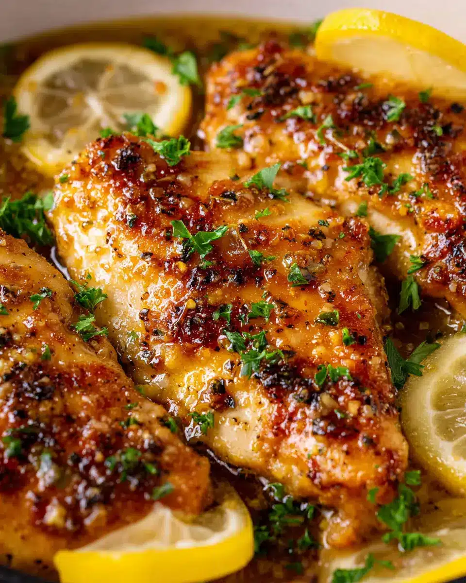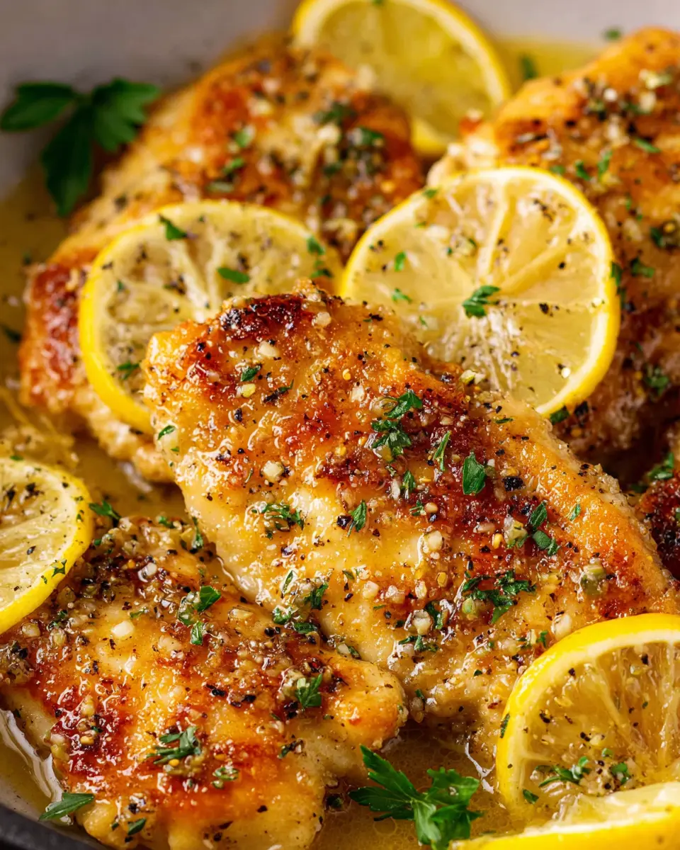 While the chicken is cooking, grab a separate saucepan. Melt 8 tablespoons of unsalted butter over medium heat with two minced garlic cloves until fragrant. Add in a quarter cup each of freshly squeezed lemon juice and chicken broth, along with a dash of ground black pepper. Let this sauce simmer for about two minutes. Once the chicken is done, pour the luscious lemon butter sauce over it, turning the chicken to coat every piece. Serve it garnished with lemon slices and finely chopped parsley for that extra pop!