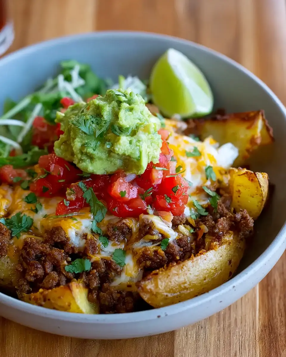 One of the best things about a loaded potato taco bowl is its versatility! Feel free to let your guests customize their bowls with toppings such as fresh jalapeños, diced bell peppers, or even crumbled turkey bacon for that extra crunch. You can set up a toppings bar, allowing everyone to create their perfect bowl—this not only makes it fun but also caters to various taste preferences. For vegetarian options, simply swap the beef for black beans or roasted veggies!