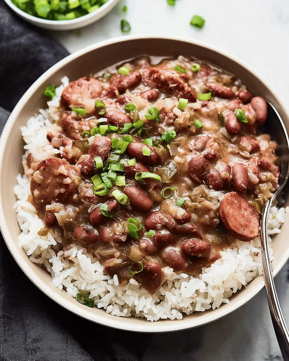 - Serve the red beans in a bowl topped with a scoop of rice and a sprinkle of sliced green onions.