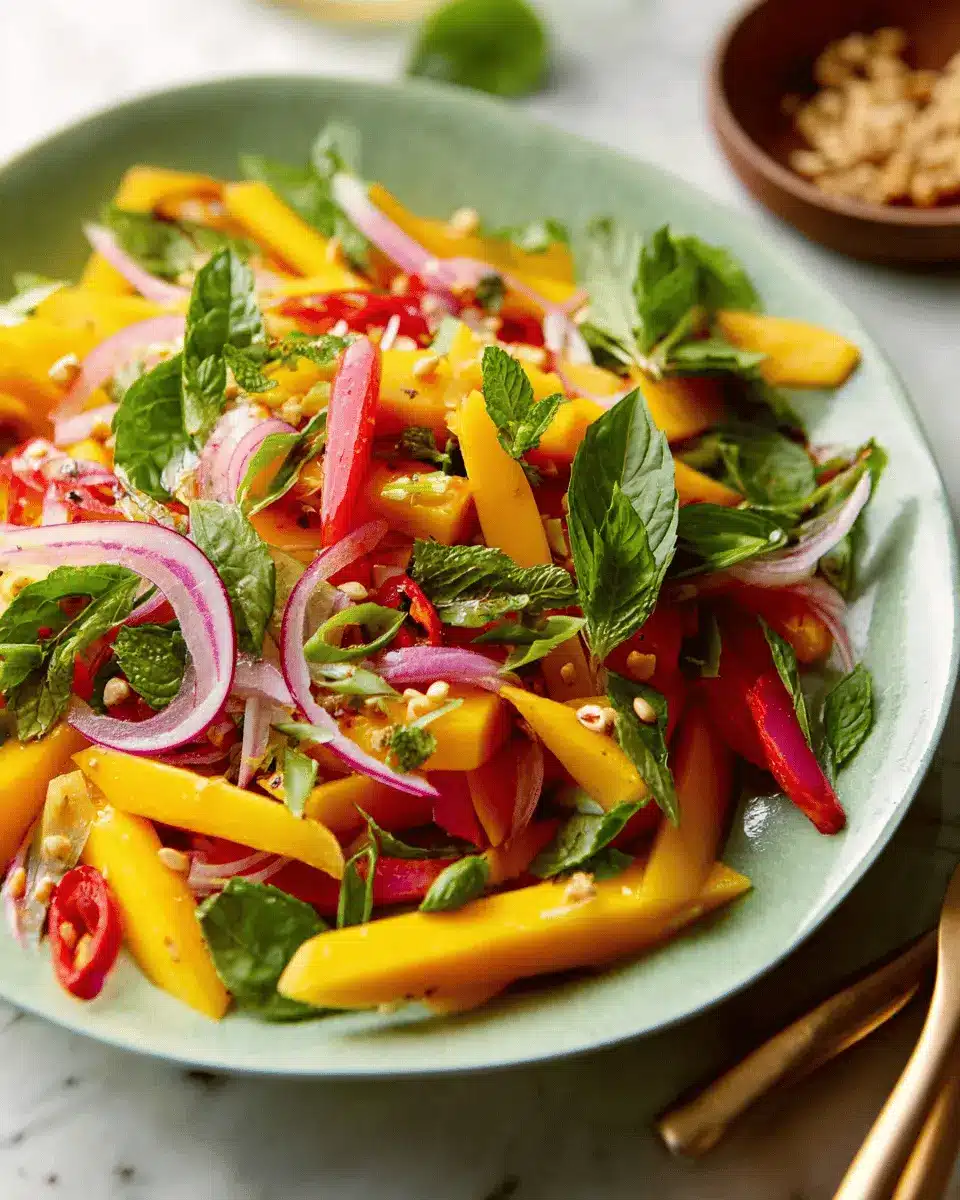 Tailor your Mango Salad to your taste by experimenting with flavor profiles! If you prefer a spicier kick, toss in some diced jalapeños or a dash of chili flakes. For a sweeter note, consider adding a drizzle of honey or a sprinkle of coconut flakes. Taste as you go!