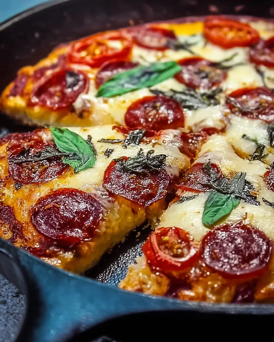 - Remove the skillet from the oven and let the pizza cool for about 5 minutes. Garnish with fresh basil if desired, slice, and enjoy!