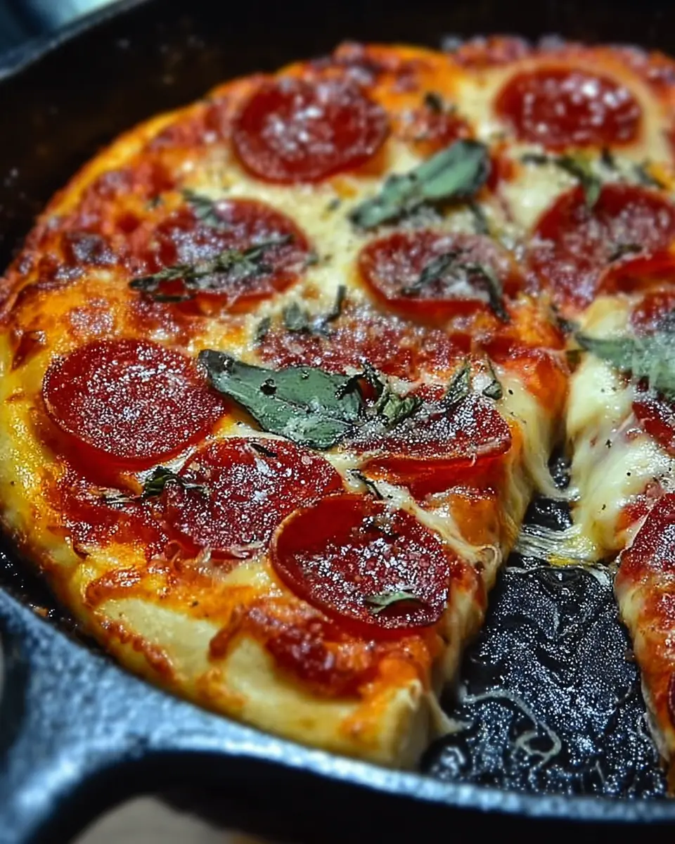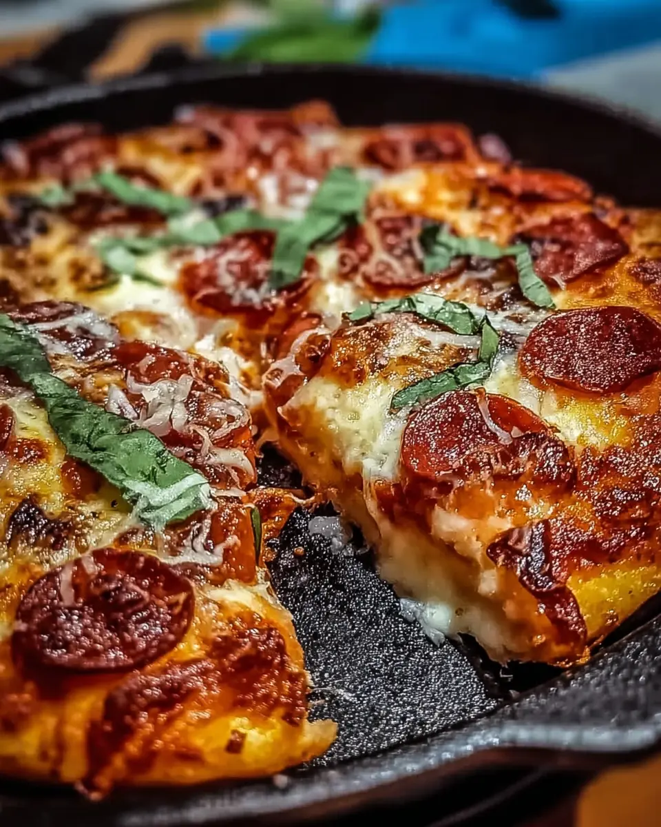This delightful cast iron skillet pizza serves about 4 to 6 people, perfect for sharing with friends or family on a cozy night in.