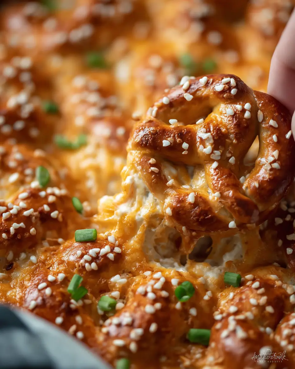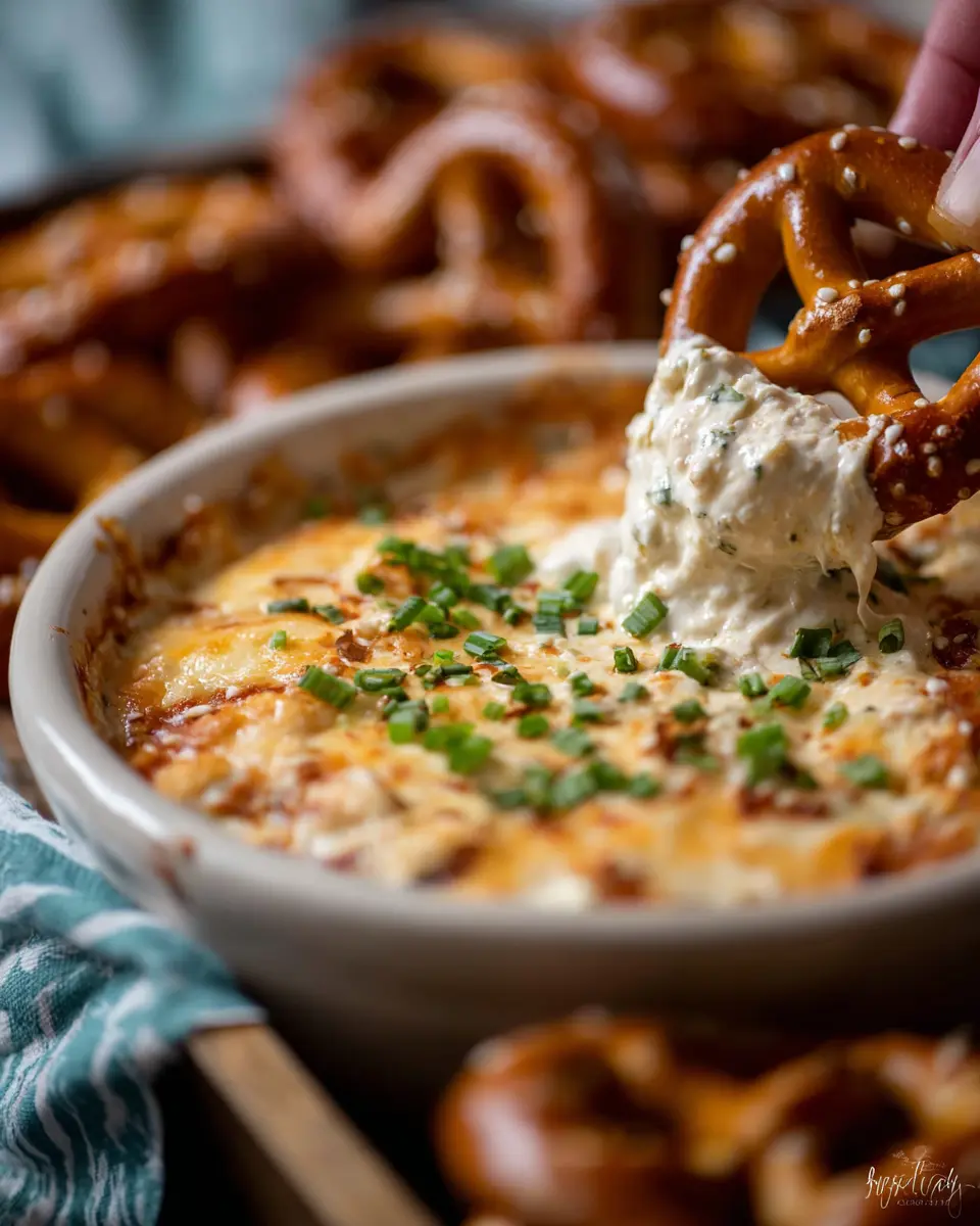 - Finally, garnish with additional diced green onions and serve with pretzels.