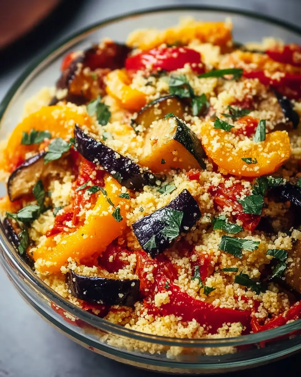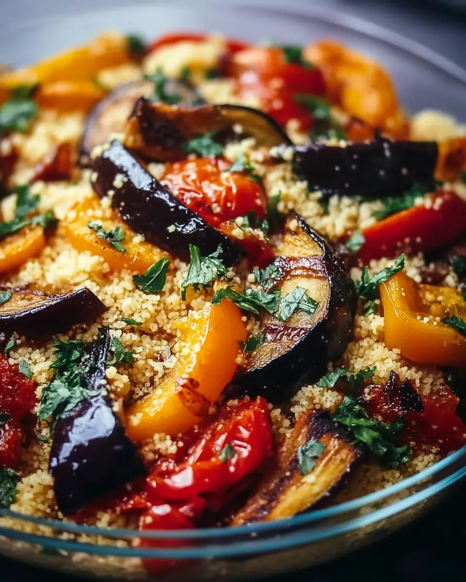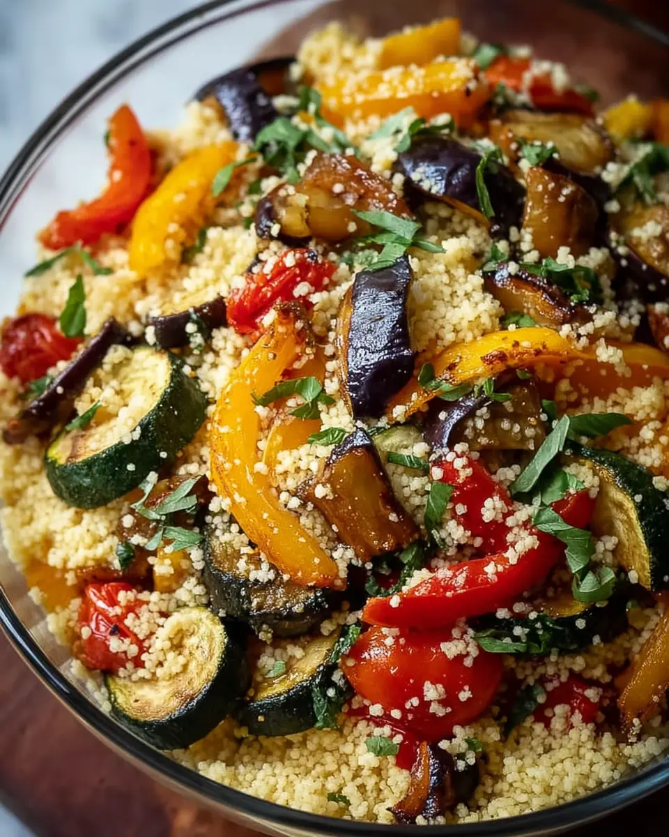 - Gently fold the roasted vegetables into the fluffy couscous, mixing well to combine all the flavors.