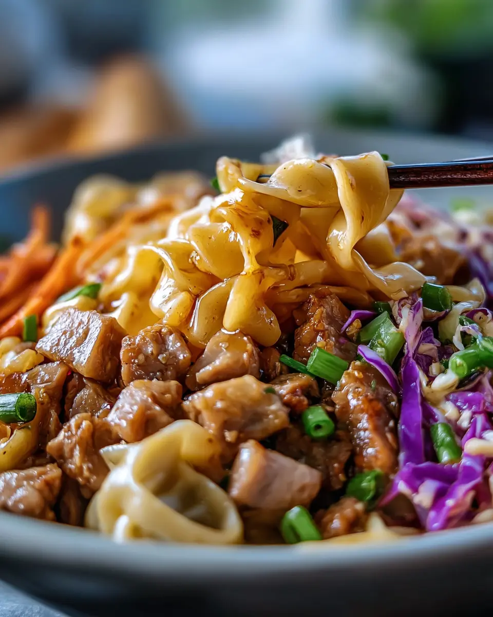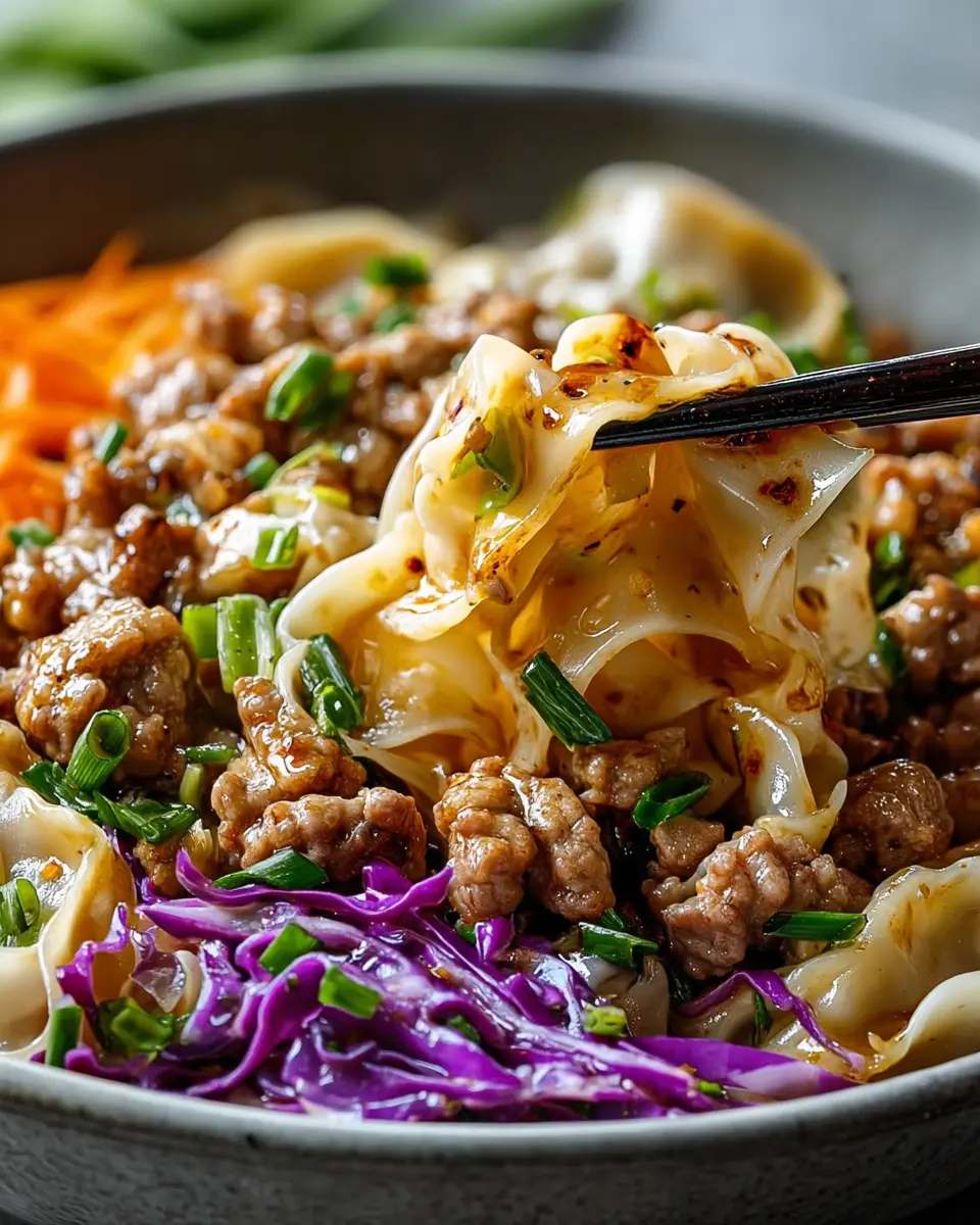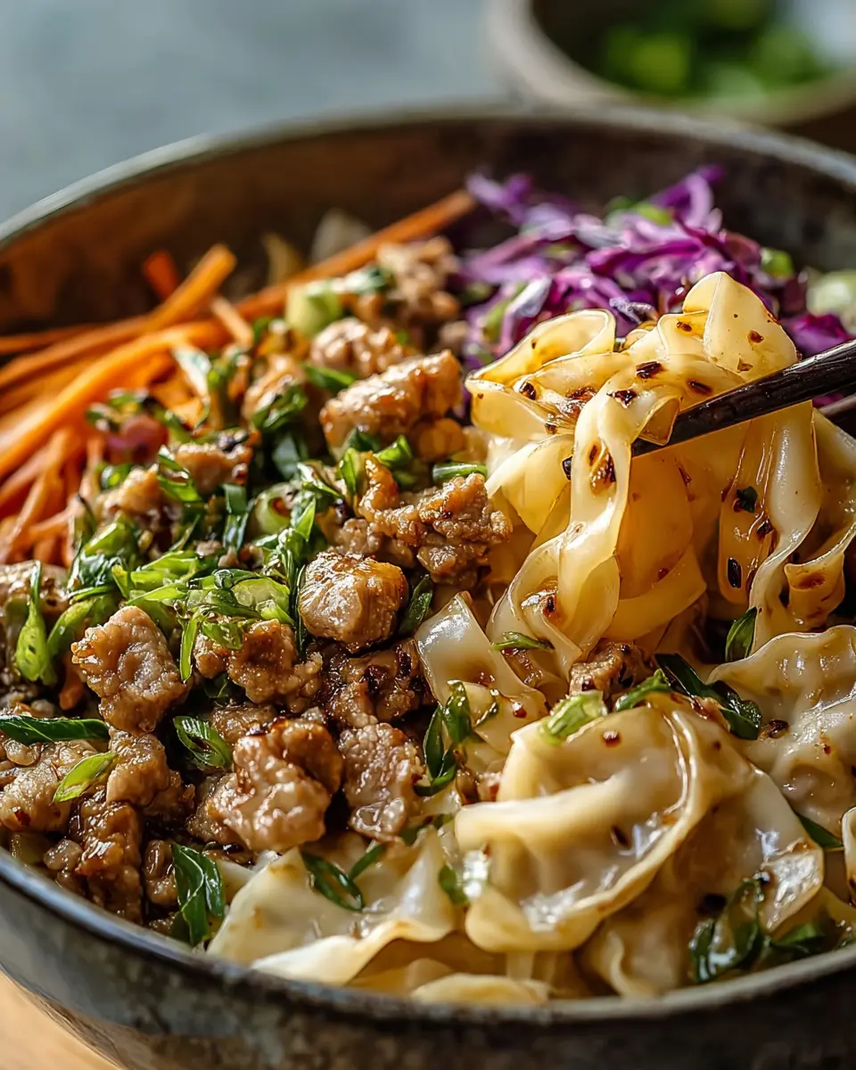 Savory Potsticker Noodle Bowl with Pork & Cabbage Slaw Delight