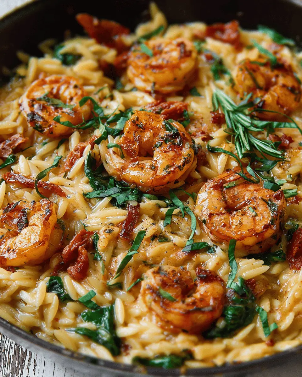 These core ingredients work together to create a beautiful base, blending the succulent shrimp with the rich and creamy flavors that orzo is known for.