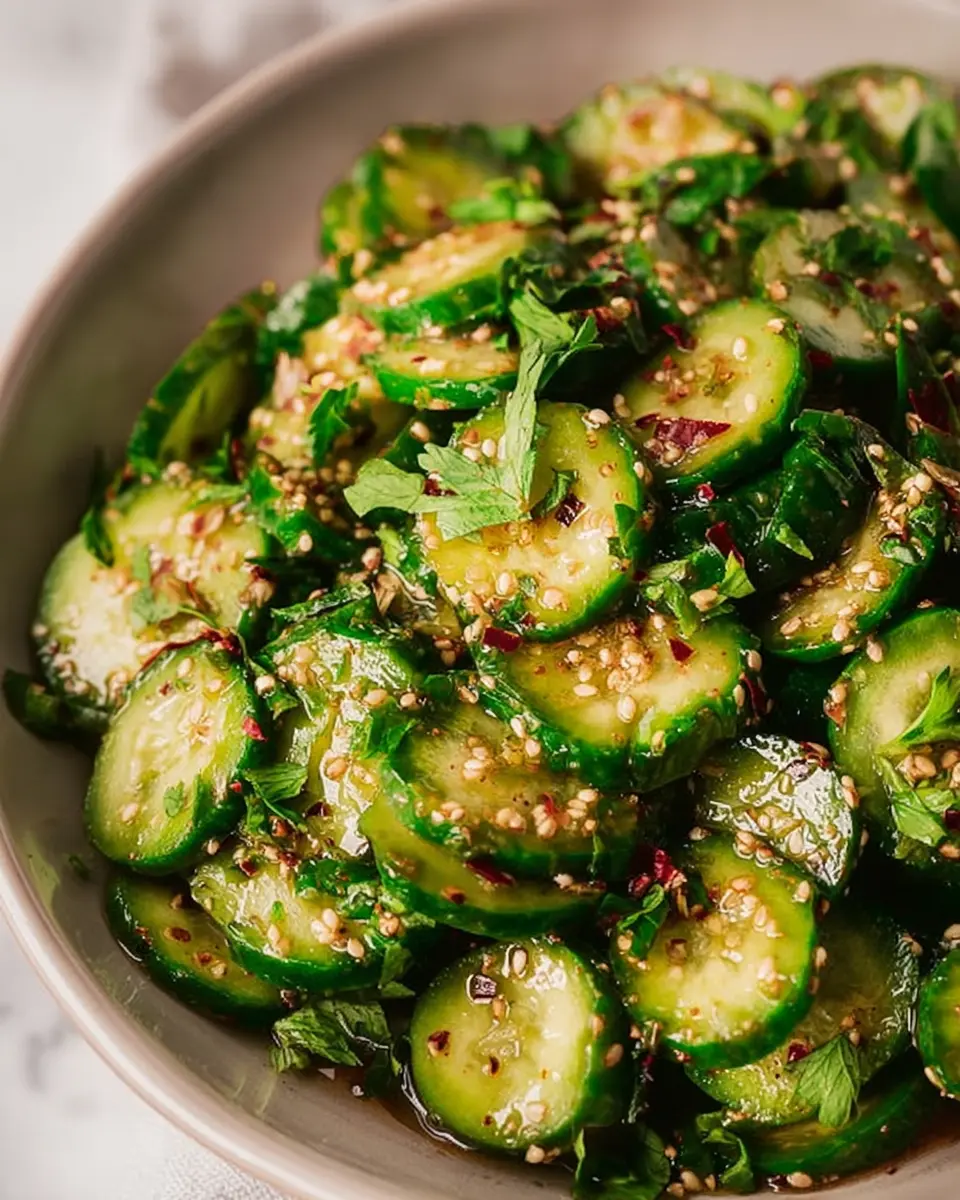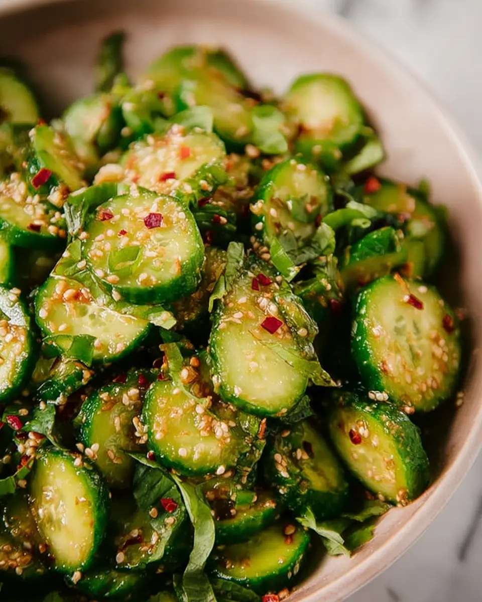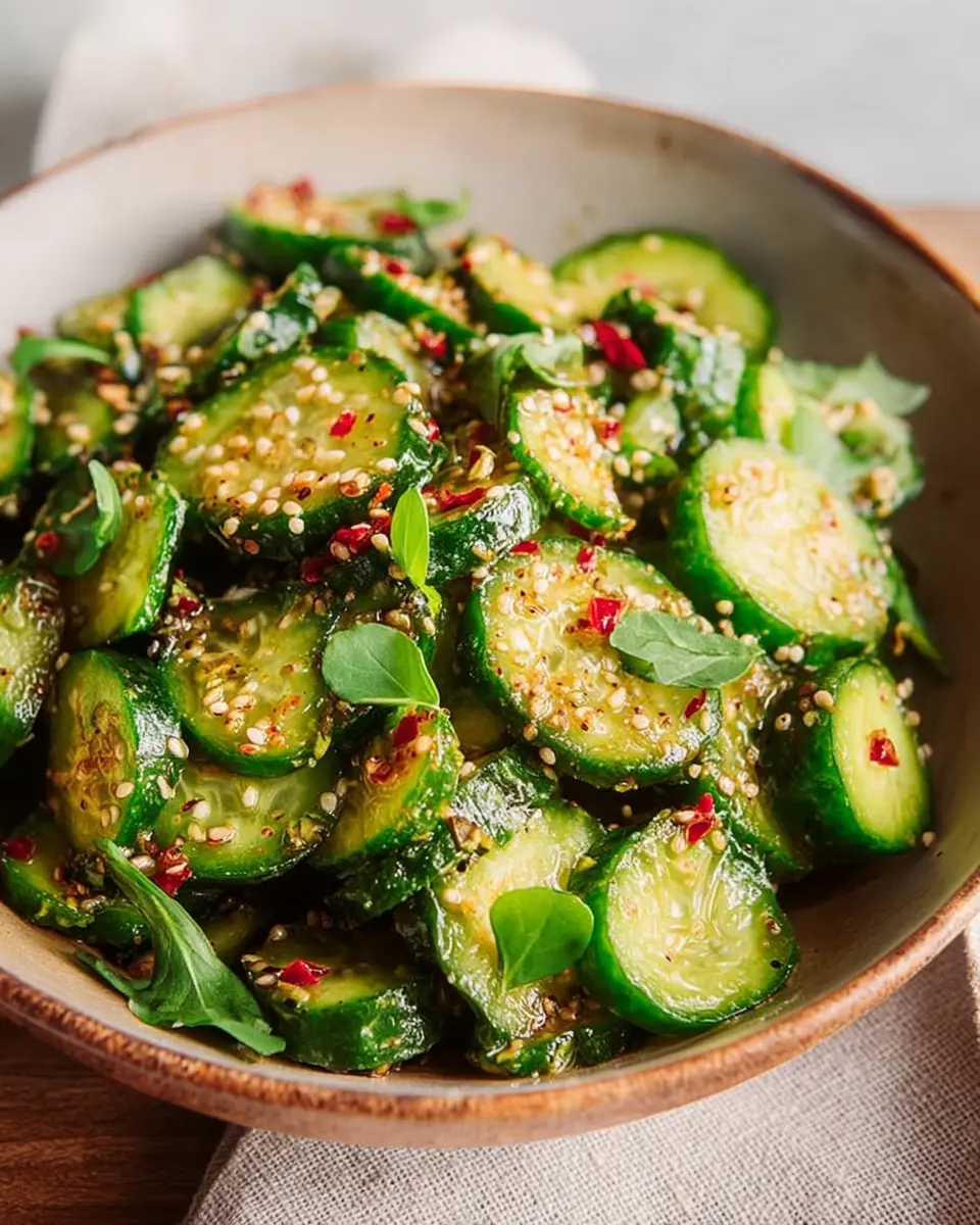 Elevate your smashed cucumber salad recipe by adding a fiery kick! Include diced jalapeños or a splash of sriracha for heat. You can also mix in a tablespoon of peanut butter or tahini to enrich the dressing with a creamy texture. Top it with extra toasted sesame seeds for that nutty crunch. This spicy twist is perfect for those who crave bold flavors alongside crunchy cucumbers.