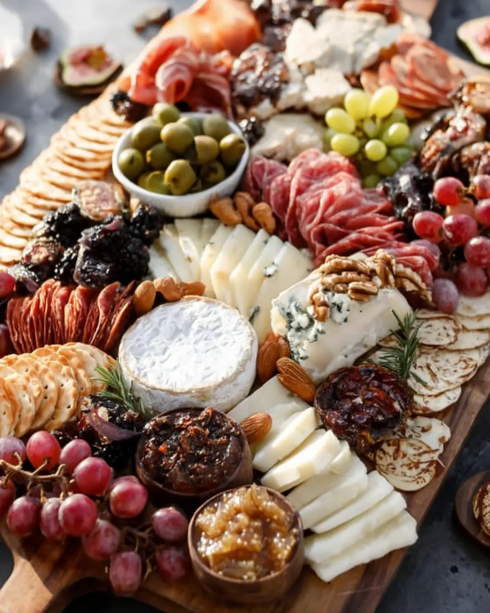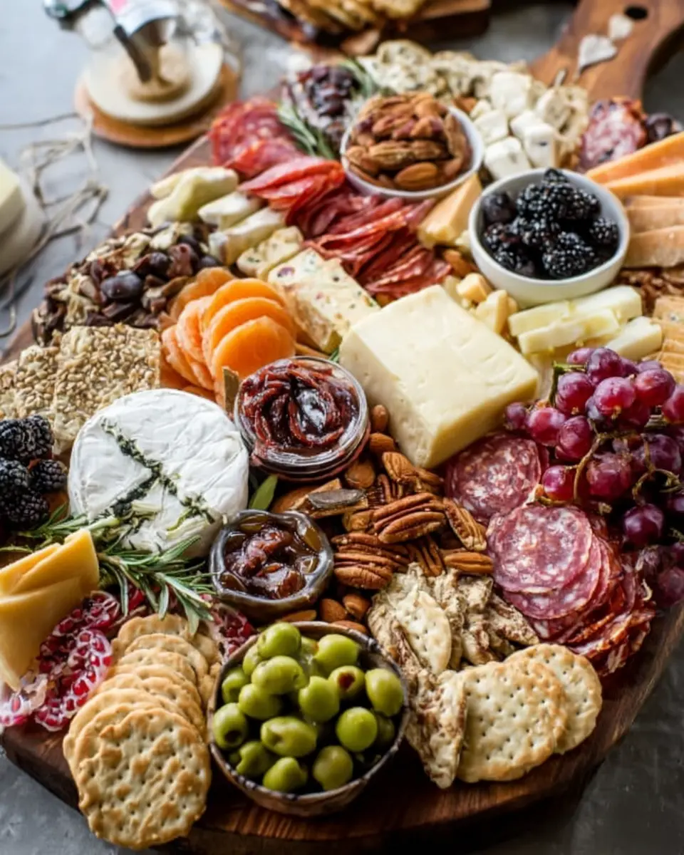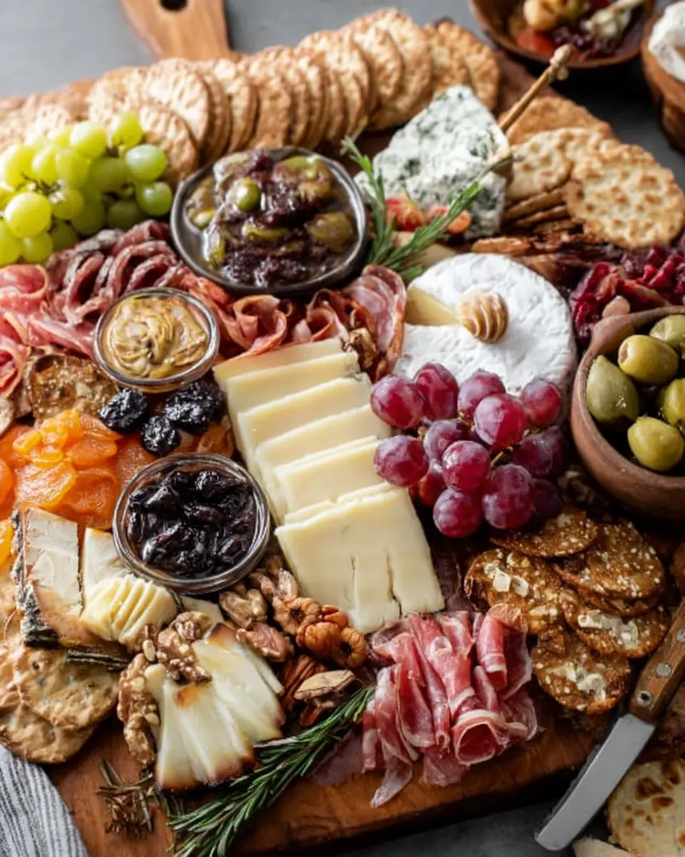 Choose an assortment of crackers to complement the board—think whole grain crackers or toasted baguettes. These serve as the perfect canvas for your cheeses and spreads!